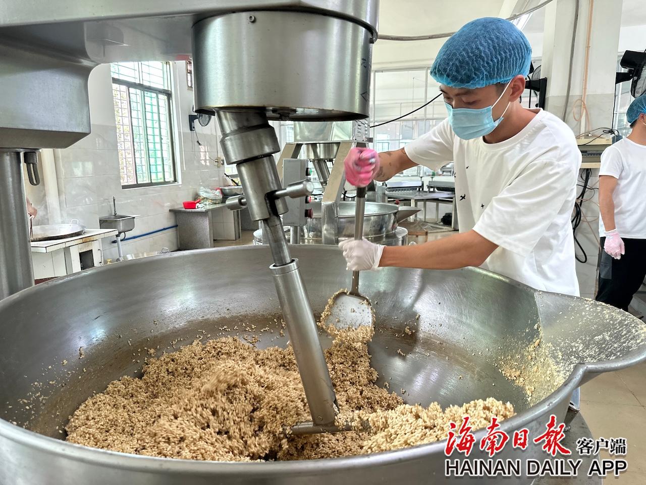 随着搅拌设备的“手臂”不停翻动,糯薏米、花生与芝麻等被均匀裹上糖浆。