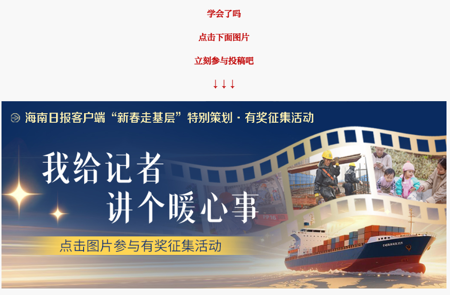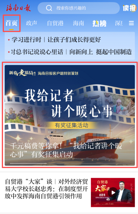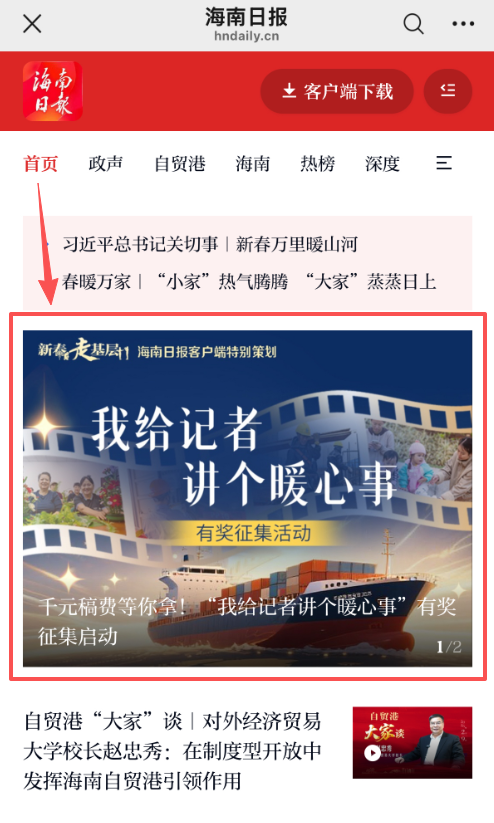 1、下载海南日报客户端APP,在首页轮播位置找到《千元稿费等你拿!“我给记者讲个暖心事”有奖征集启动》稿件,点击进入稿件。