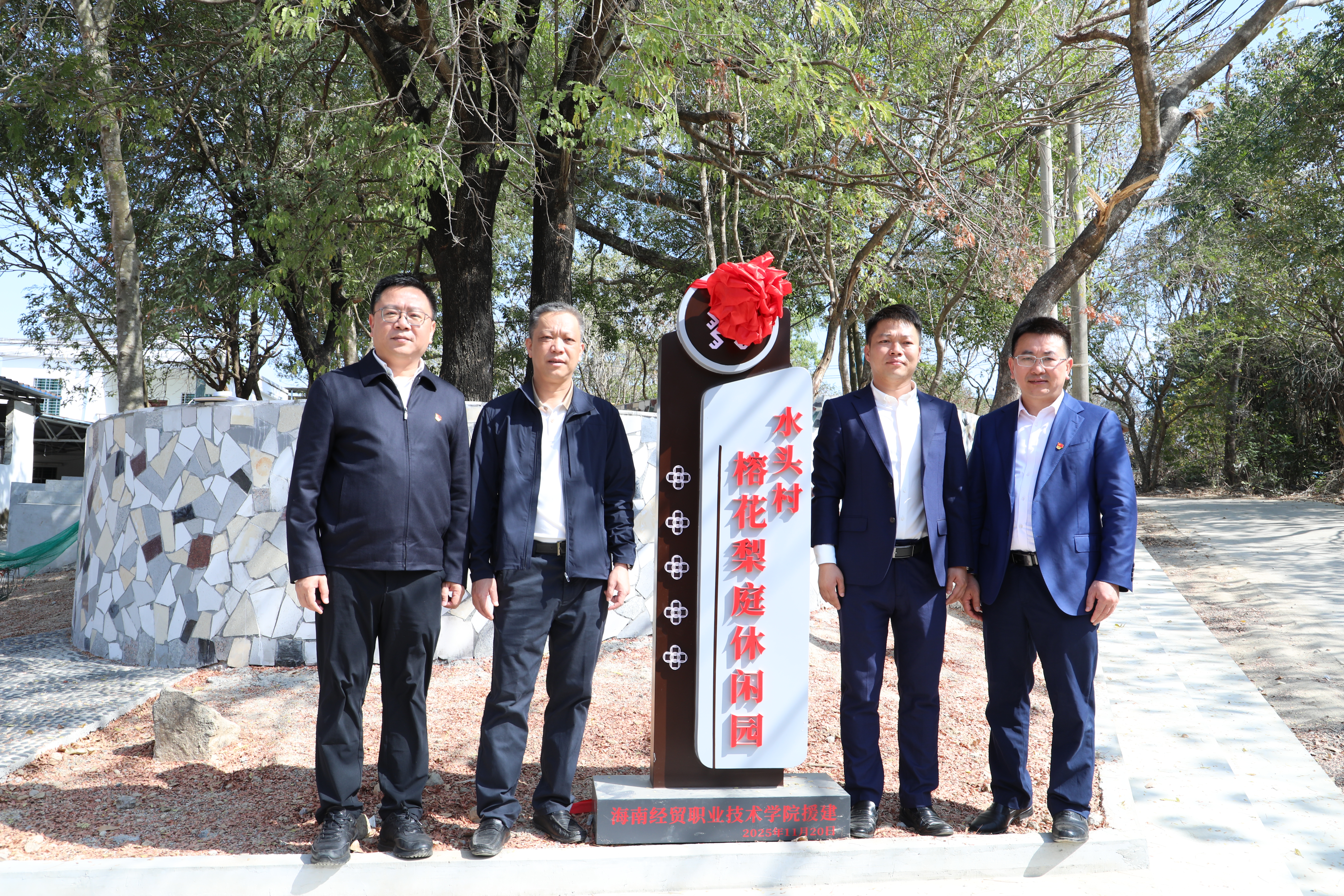 当天,水头村“榕花梨庭休闲园”揭幕。该园由海经贸投入帮扶资金建成,占地约900平方米,旨在提升村民文化生活品质。随后,各方在大榕树下围坐,听取学校驻水头村“第一书记”汇报2025年工作情况,专题研讨水头村2026年乡村振兴工作计划与具体举措,围绕人居环境、乡村治理、教育帮扶、品牌打造等方向谋划具体举措。