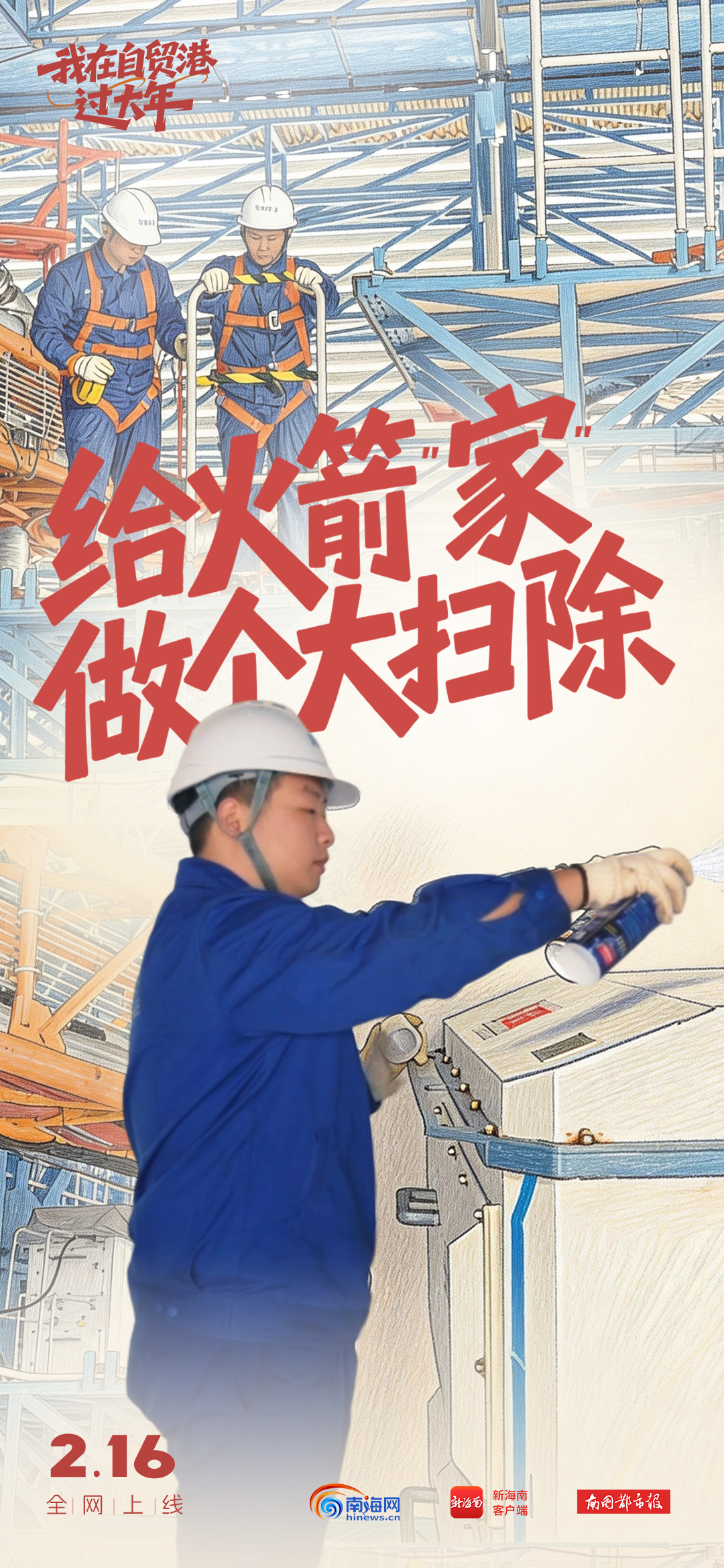 从今天(2月16日)起,海南日报、南海网、南国都市报联合推出新春走基层系列视频《我在自贸港过大年》。除夕当天,第一期《我在火箭“家”做大扫除》正式上线。