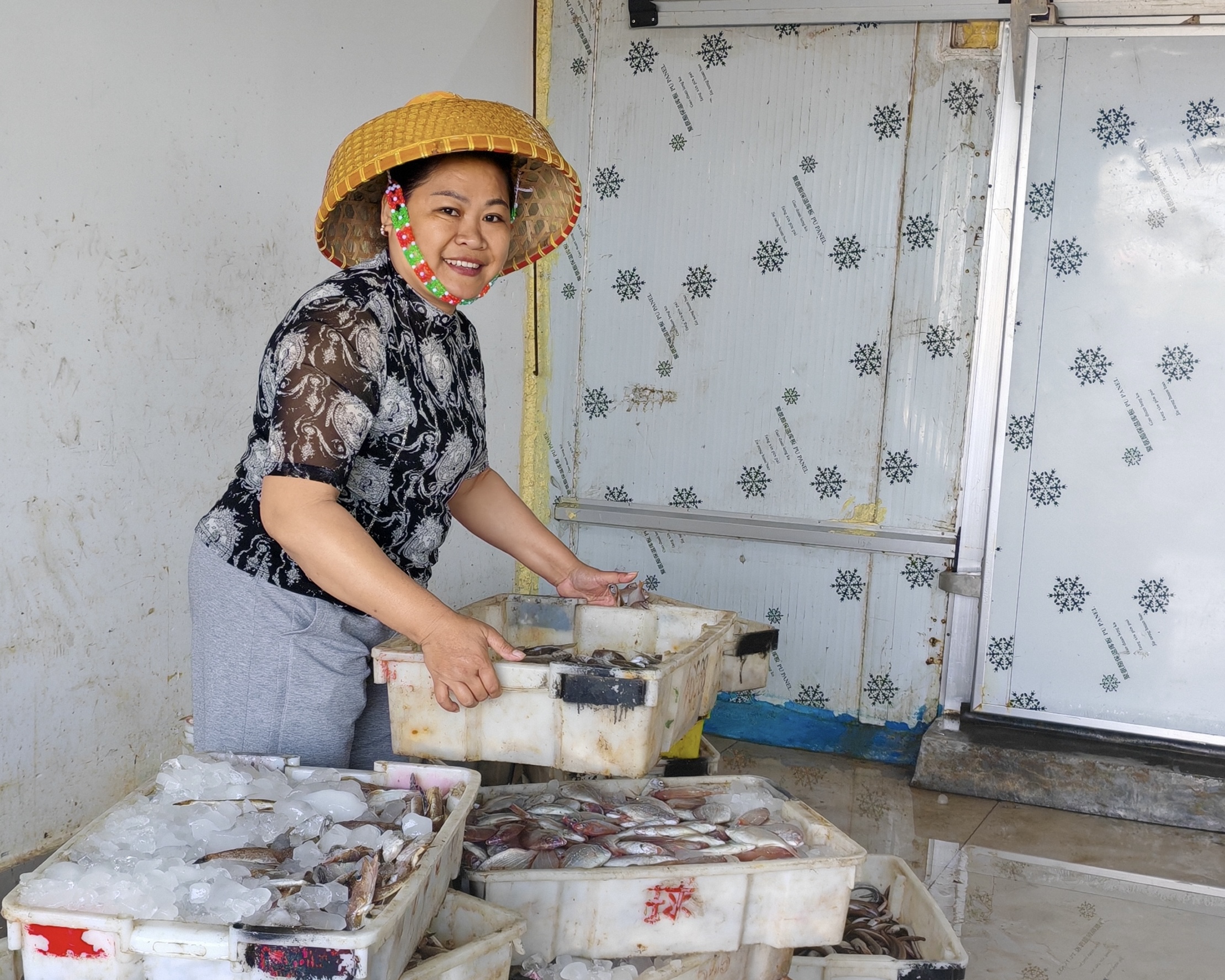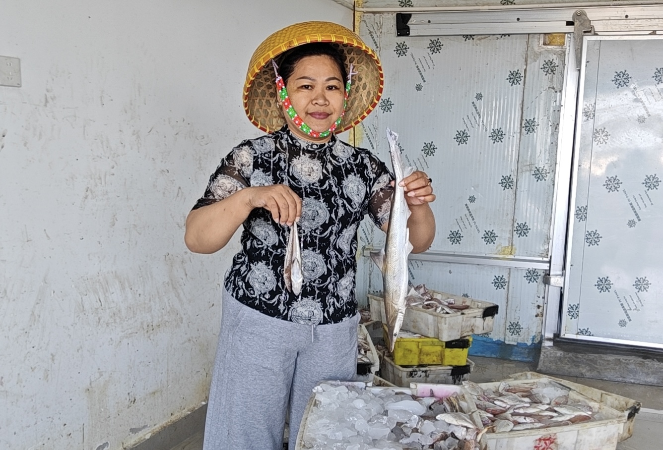 陈春萍手拿从渔船上卸货不久的海鲜。受访者供图