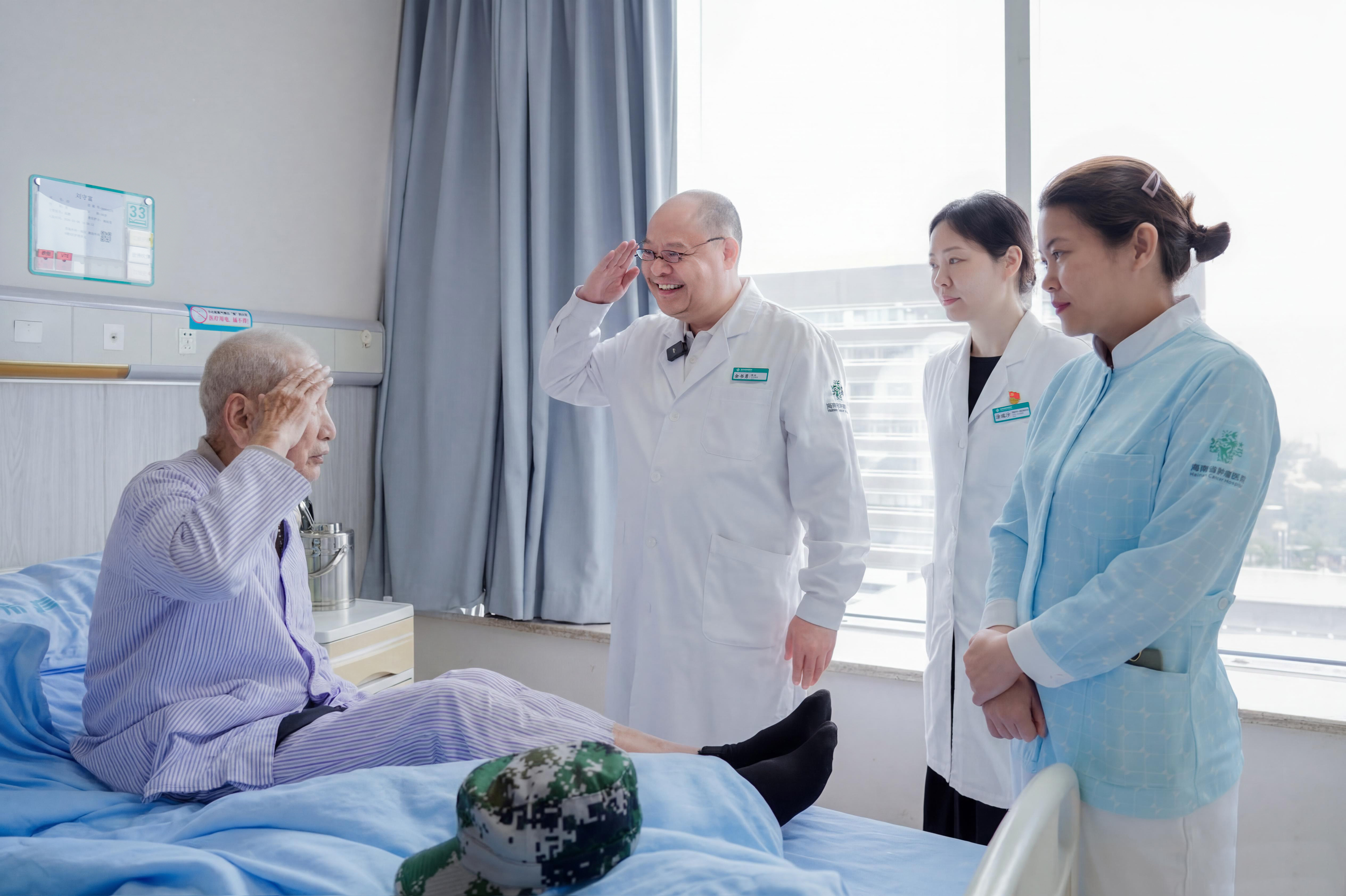 “您恢复得特别好啊!精神头真不错!”余书勇查看结果后,专程来到病房看望刘爷爷。见到同为军人出身的余书勇,刘爷爷郑重地敬了一个军礼。