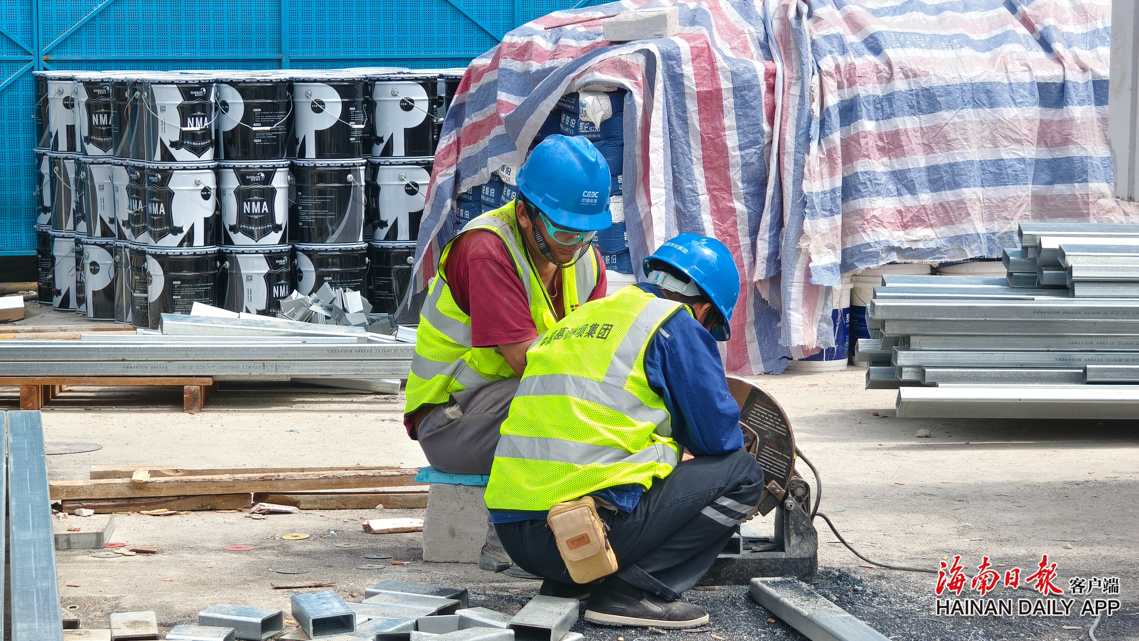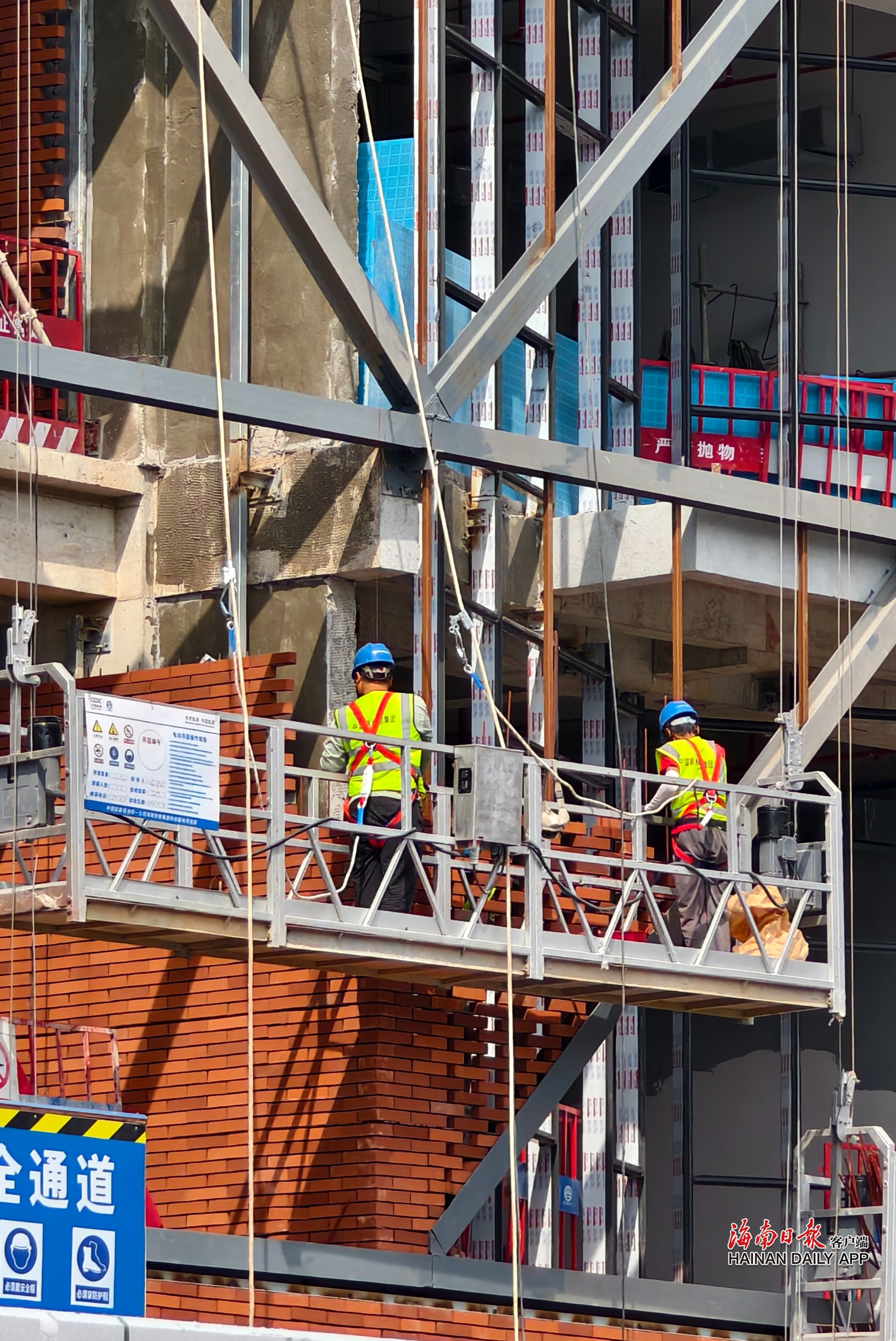 两名施工人员开展外立面施工。海南日报全媒体记者李梦楠 摄