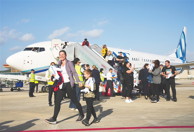 2025年12月22日,全国首批第七航权航班旅客从捷克布拉格飞抵海南三亚。图为来自捷克布拉格的旅客走下飞机。海南日报全媒体记者王程龙 摄