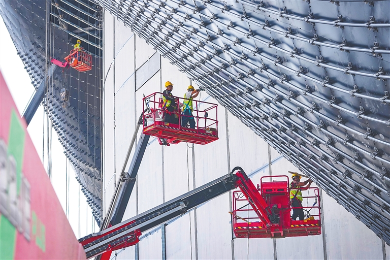 2月26日,位于三亚湾的中国海南国际文物艺术品交易中心,工人们加快推进项目建设。海南日报全媒体记者王程龙 摄