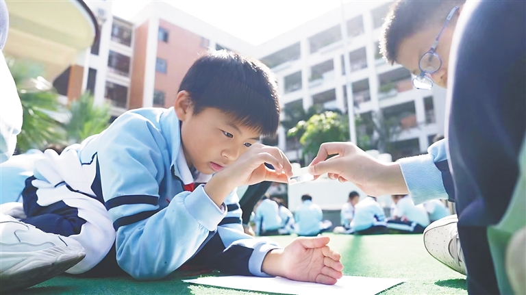 海口市滨海第九小学学生在操场上用三棱镜观察光的色散。王康特 摄