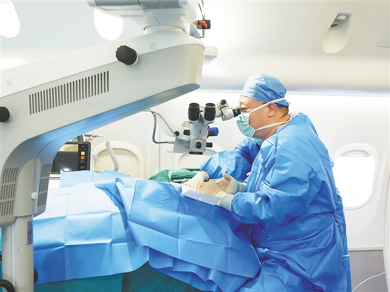 中山大学眼科中心医护人员在机舱内为海南患者开展眼疾病治疗手术。