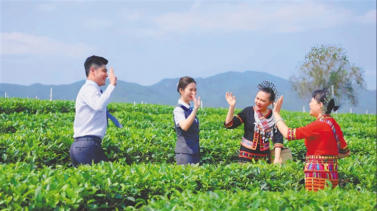 海南农商银行白沙支行员工深入农户茶园查看茶叶生长情况。