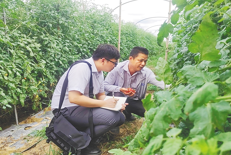 海南农商银行定安支行员工在农户圣女果种植基地认真了解圣女果挂果情况。
