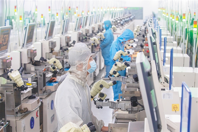 海口综保区内锐骏微电子有限公司生产车间,工作人员操控各类设备。车间半导体元器件经多道智能工艺加工后,将发往全球电子产业链下游企业。海南日报全媒体记者袁琛 摄