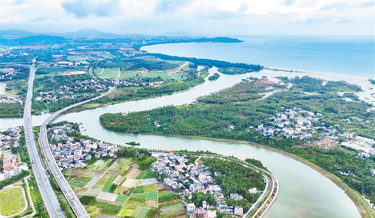 资料图 俯瞰位于三亚市藤桥河入海口处椰子洲岛的海丰村。