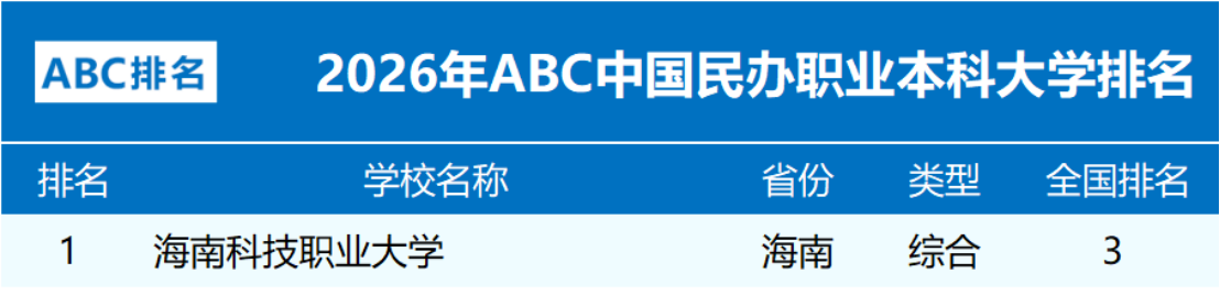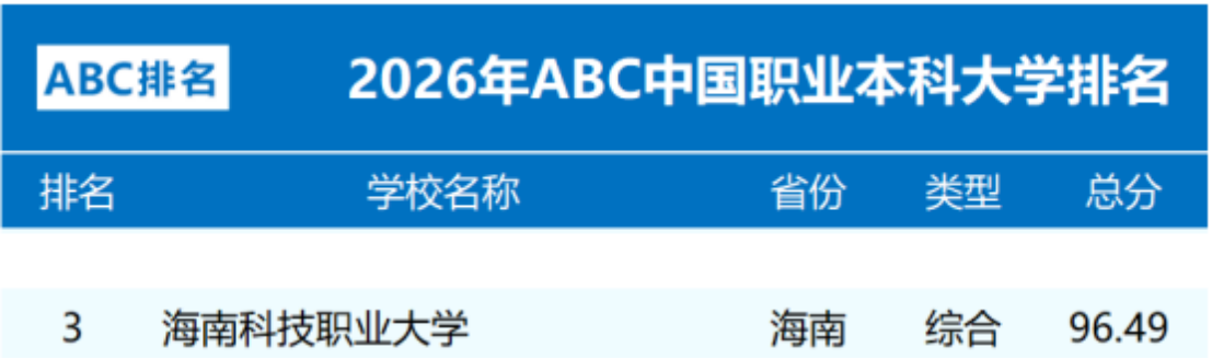 近日,2026年ABC中国职业本科大学排名发布。海南科技职业大学位列全国职业本科高校第三、民办职业本科高校第一,连续多年稳居中国民办职业本科大学榜首。